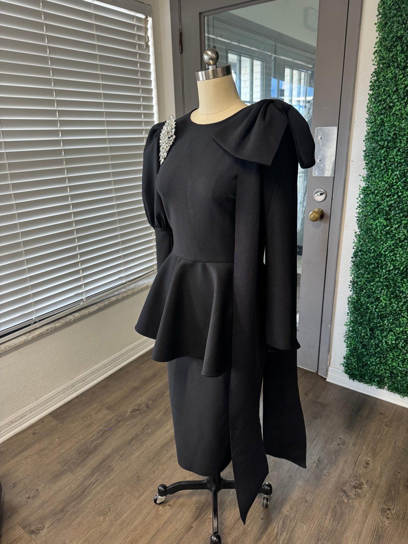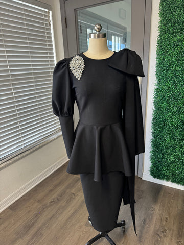 Black stretch knit peplum dress with overs size bow. Invisible zipper backing. Brooch not included.