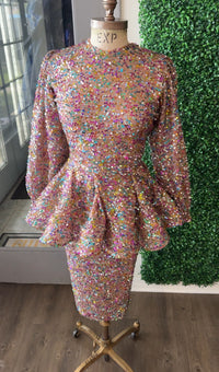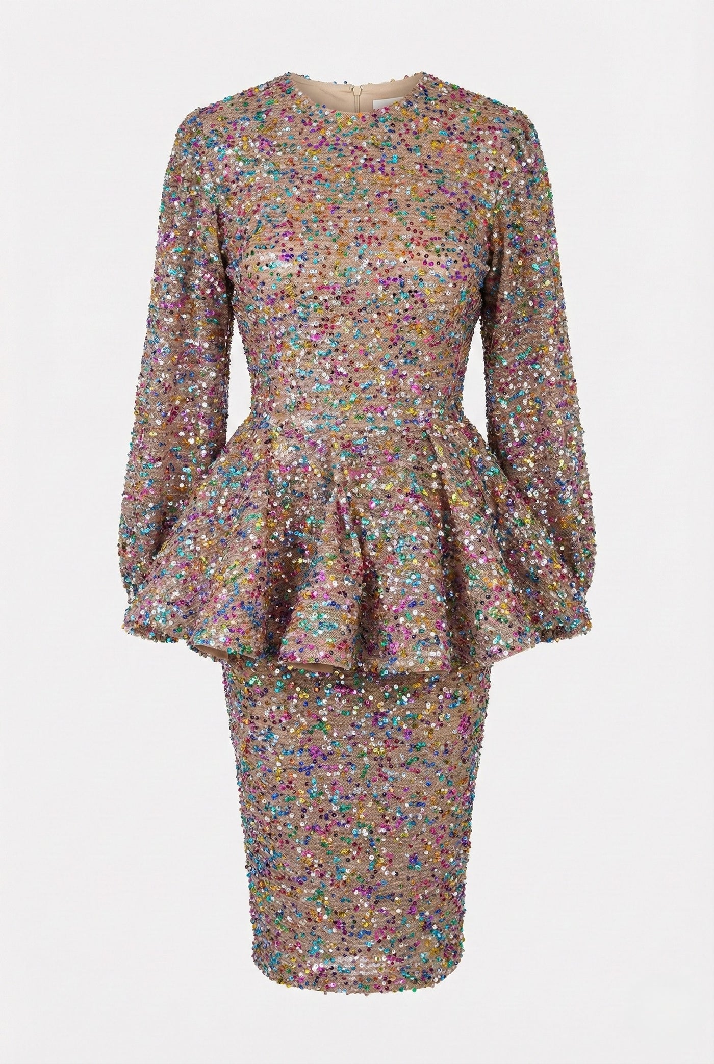 Crafted in a rich mocha tone, this peplum dress features an all-over sequin embellishment for sophisticated shimmer. The fully lined silhouette ensures comfort and opacity, while a discreet back zipper provides effortless dressing. Perfect for evening events and special occasions.